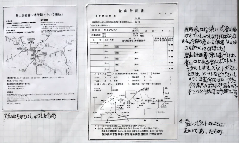 長野県では条例により、登山届の提出が義務づけられています。登山口のポストに投函するか、オンラインで提出する方法があります。今回は木曽駒ヶ岳ロープウェイの駅にポストがあったので、そこへ投函しました。