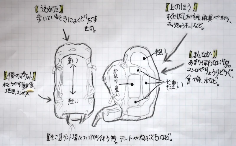 装備が揃ったら、リュックサック(ザック)に詰めます。ここにもコツがあります。詰め方が悪いと重心がずれてバランスが崩れ、疲れやすくなり、転倒リスクも上がります。