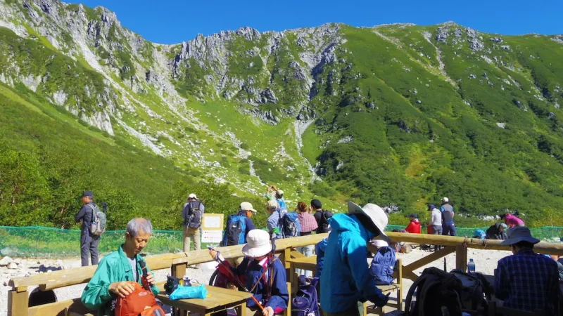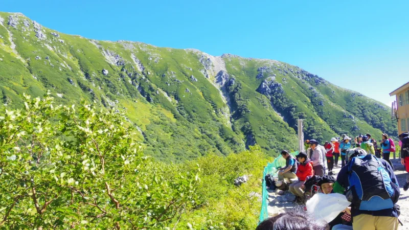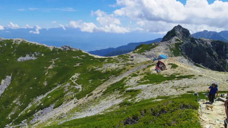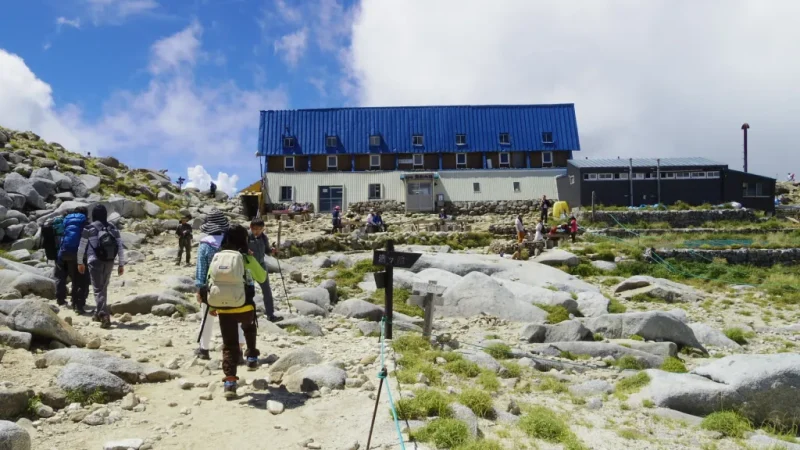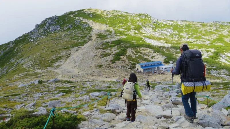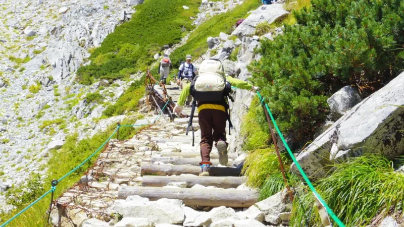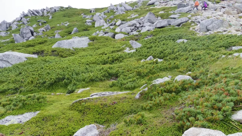 標高2500メートルを超える高山帯は「森林限界」と呼ばれ、樹木が育ちません。ハイマツ(腰ほどの高さしかない松の仲間)が地を這うように広がり、その先には岩場と空だけが続きます。これまで登ってきた高尾山や筑波山の緑豊かな山道とは、まるで別世界です。