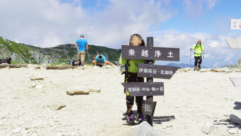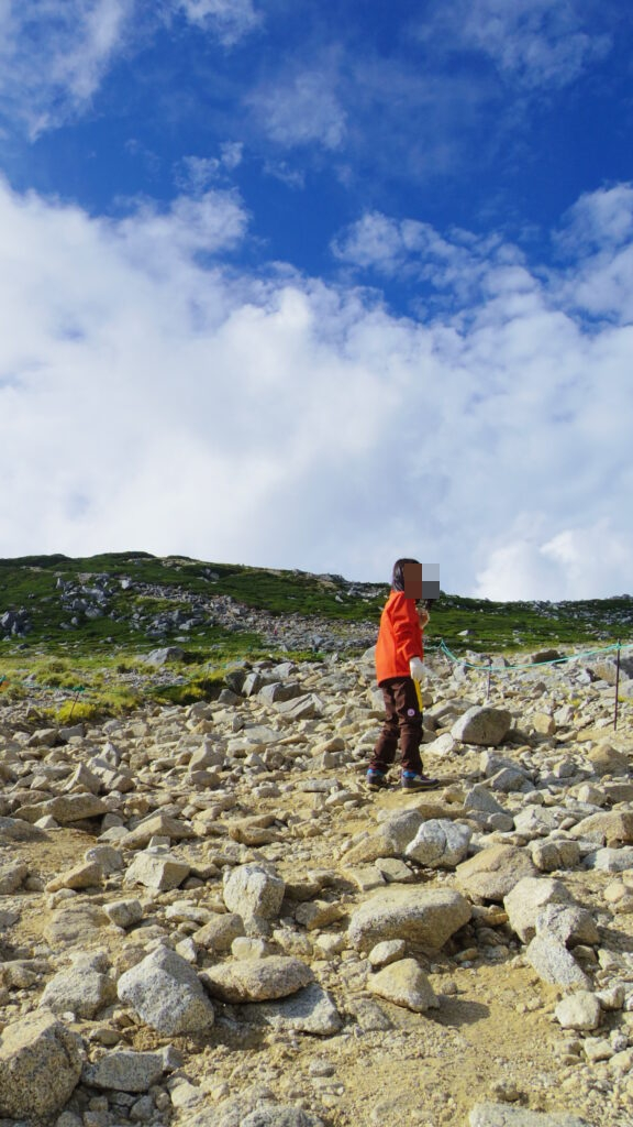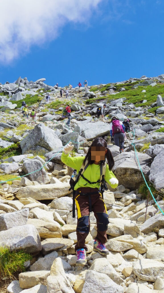 昼休憩をとってから、中岳(2925メートル)へ向かいます。宝剣山荘、天狗荘と山荘を通り過ぎ、岩だらけの稜線を進みます。大人たちにどんどん抜かされながらも、娘は黙々と歩き続けました。