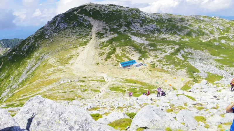 中岳の反対側を下ると、今夜泊まるテント場が見えてきます。急な岩場を「急がず、あわてず、ゆっくり」と下ります。浮き石(踏むとグラグラする石)が多く、油断すると足をとられます。