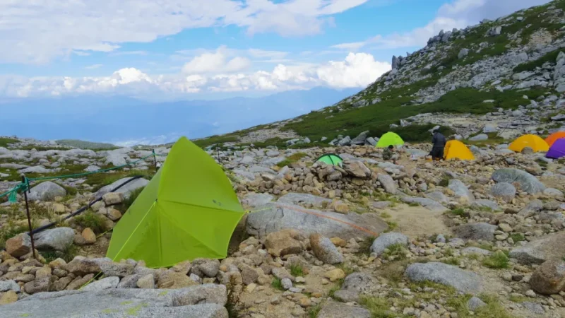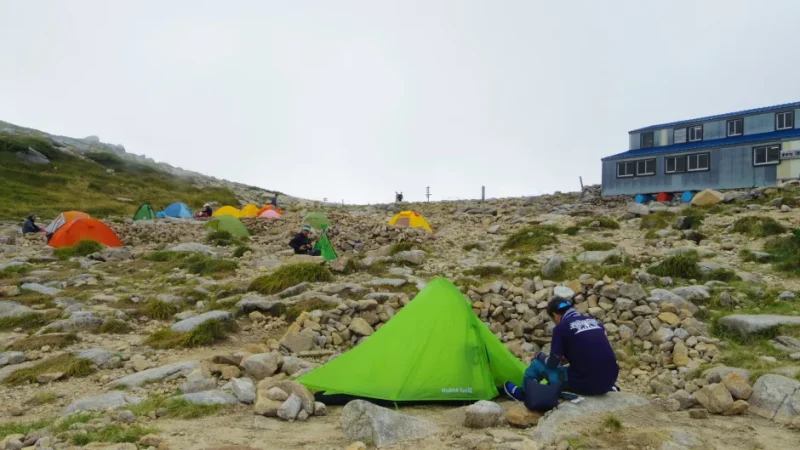 テント場に着いたのは午後の早い時間。22張りのテントが先に並んでいました。私がテントを設営するあいだ、娘は「暇だから」と読書をはじめました。その図がなんとも山らしくて、よかった。