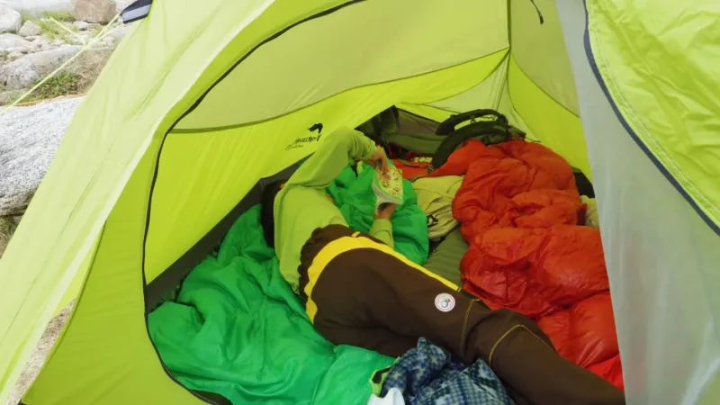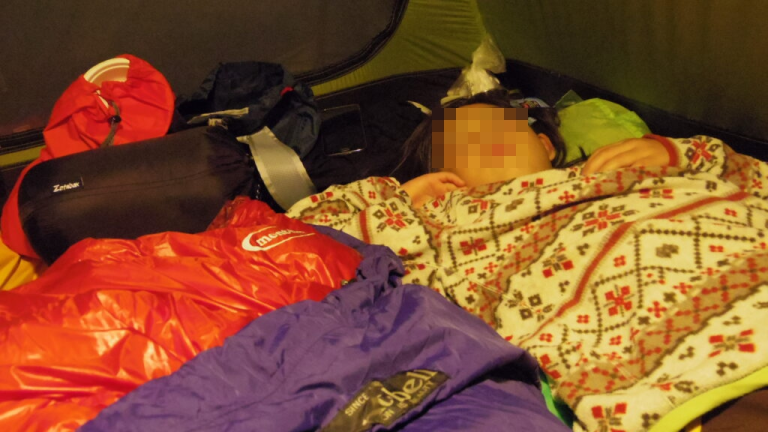 夜中、テントが台風のような音を立てていました。ビュウビュウという風の音で何度も目が覚めましたが、娘はぐっすり眠っていました。「テントが飛ばされそうで気になって眠れなかった」と翌朝打ち明けると、娘は「知らなかった」とあっさり言いました。