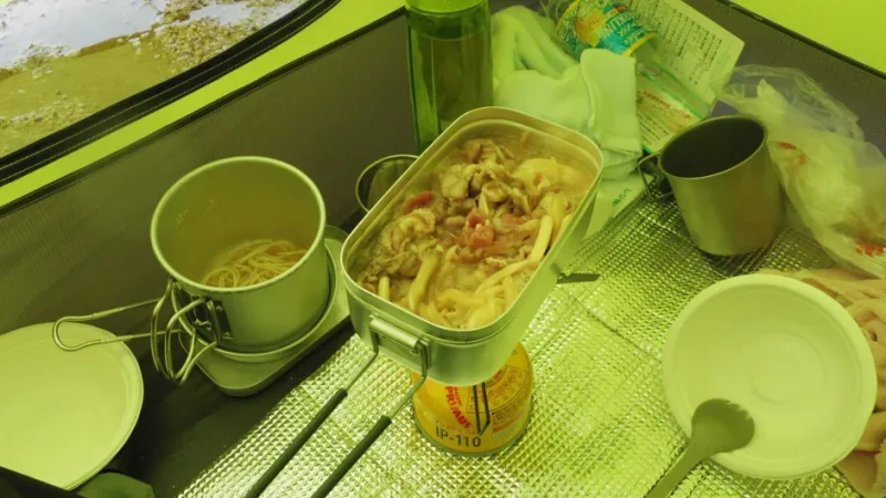 テントに戻って夕食の準備をはじめたところで、夕立が降り出しました。ラーメンとジンギスカンをテントの中で慎重に調理し、二人で食べました。山で食べるごはんは、なぜか何倍もおいしく感じます。