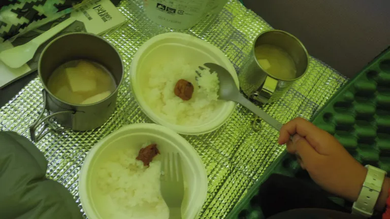 朝食はテントの中でフリーズドライのご飯と具だくさんの味噌汁。娘も手伝ってくれました。雨具を着込んで出発です。