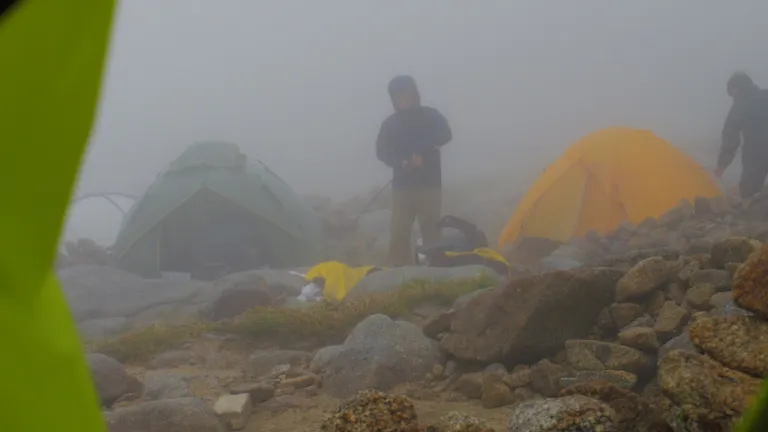 夜明けとともに起きると、テント場は深い霧に覆われていました。雨も降っています。あたり一面、乳白色の世界です。テントの床が少し濡れていました。
