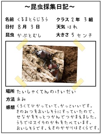 これをまとめると「○○公園の昆虫マップ」や「夏の昆虫カレンダー」といったテーマに発展させることができます。